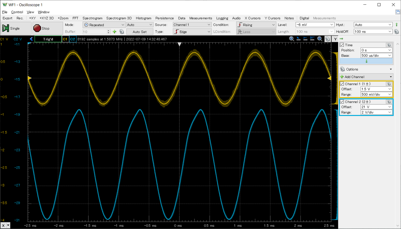 上の黄色が入力、下の青色が出力です。出力は、VoとVccの電圧を測っています。ピーク-ピークの電圧差は1.8Vなので、電流に換算すると、1.8/1.25k=1.44mAp-pになります。